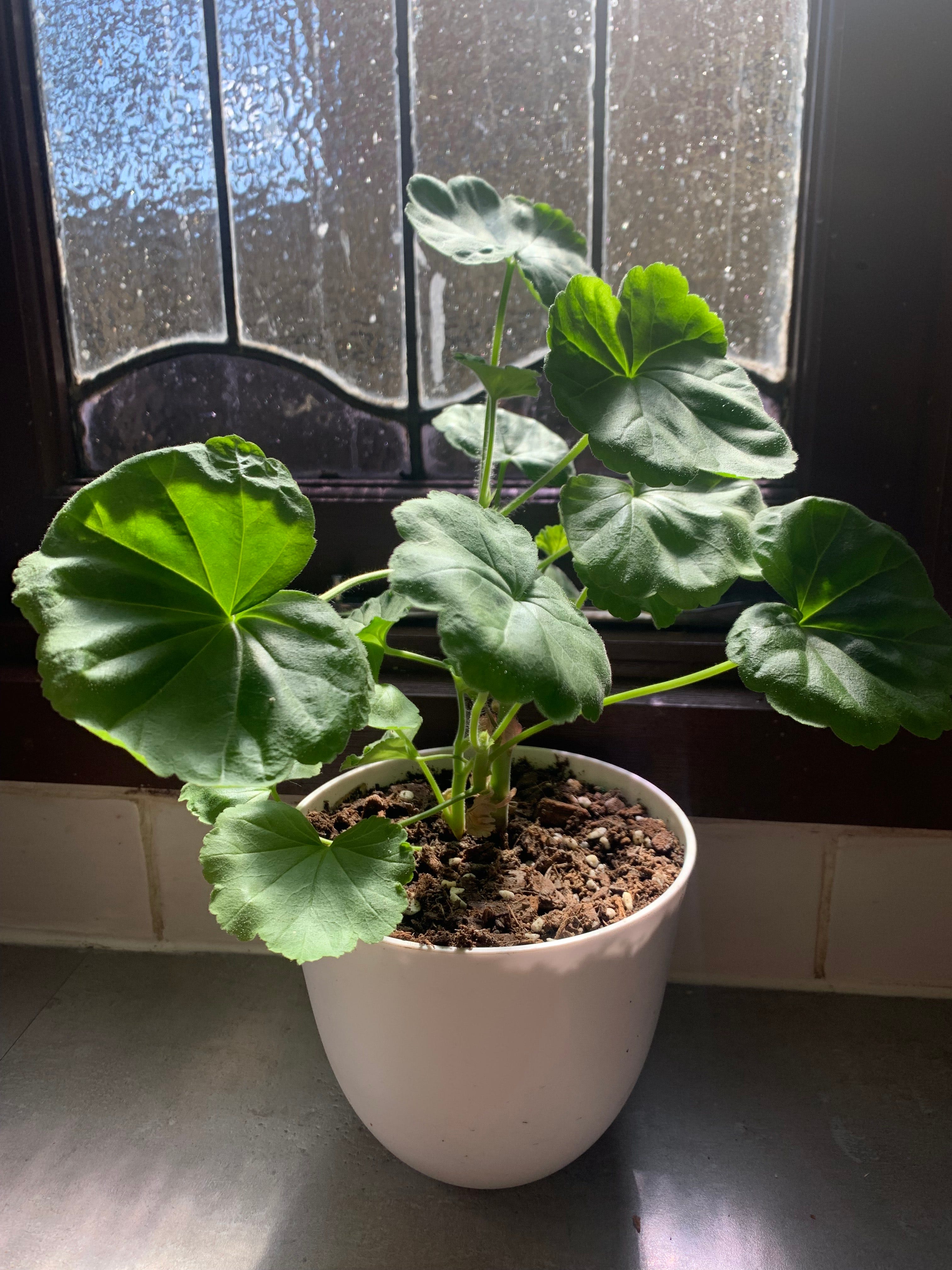 The geranium in the jar quickly sent out long roots and outgrew the jar. My daughter potted it in soil and returned it to the place by the window to remind us to water it and keep an eye on it until it was happily established in the pot and then we’d put it outside, since a geranium isn’t an indoor plant. But it’s been there for weeks now, and the plant keeps on growing taller and wider. I haven’t seen a flower since it went into the pot, though, and soon I’ll have to put it outside as I think it needs more light if it’s to flower. I enjoy seeing it in the mornings, though, when I get up and put on the kettle by the currently rain-spattered leadlight window. The early morning sun shows up the soft fur on the round leaves with their curly edges, and without having to form a specific thought, I feel the closeness of family memories, and the gentle presence of love: Dani’s love in thinking of me and bringing me the cutting, my brother’s gentle love for me and the time we spent together in that house, and the love of other family members who are gone now, past generations who loved us and loved these plants that bloomed readily even when there was little rain to be seen.