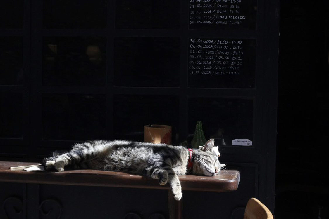 Orlando the dreaming tabby cat, at Vacilando Cafe, Istanbul, 2025